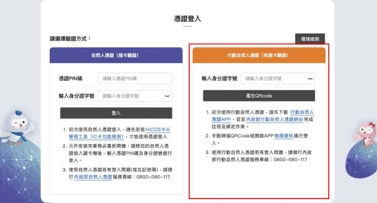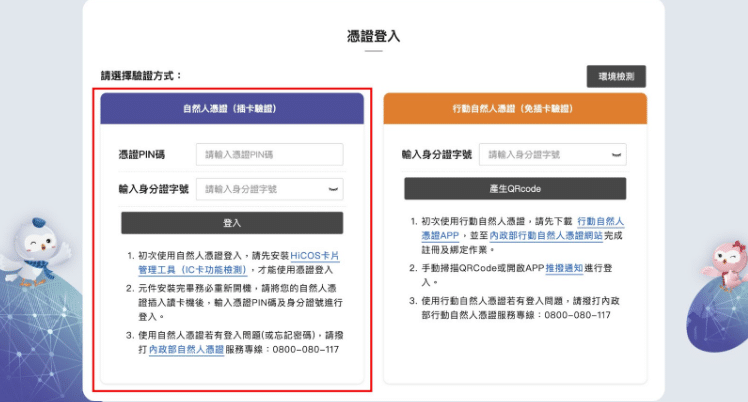 • 有效的自然人憑證及IC讀卡機 或 註冊並安裝行動自然人憑證APP(兩種方式則一)